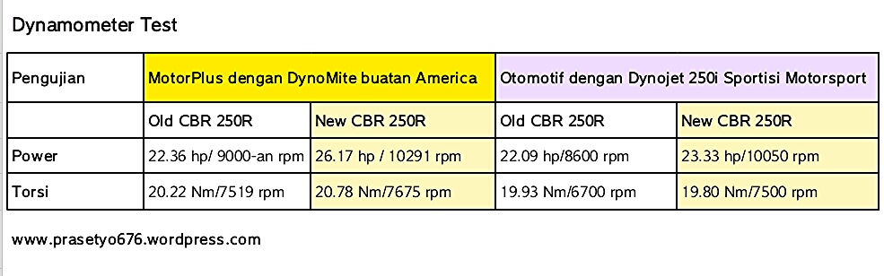 Selanjutnya, hasil pengujian performa Old CBR 250R dan New CBR 250R juga dilakukan oleh team tabloid MotorPlus. Pengujian power dan torsi on wheel dilakukan dengan menggunakan dynamometer DynoMite buatan Amerika. Untuk hasilnya terlihat berbeda dengan data hasil pengujian team Otomotif.