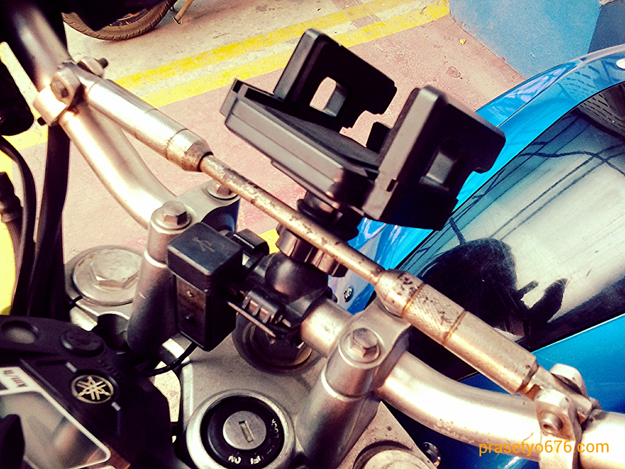 Pada areal setang, terpasang holder untuk gadget, lengkap dengan colokan charger USB, sehingga memudahkan sang rider saat melakukan touring jauh, dan kondisi hand phone sudah low battery.
