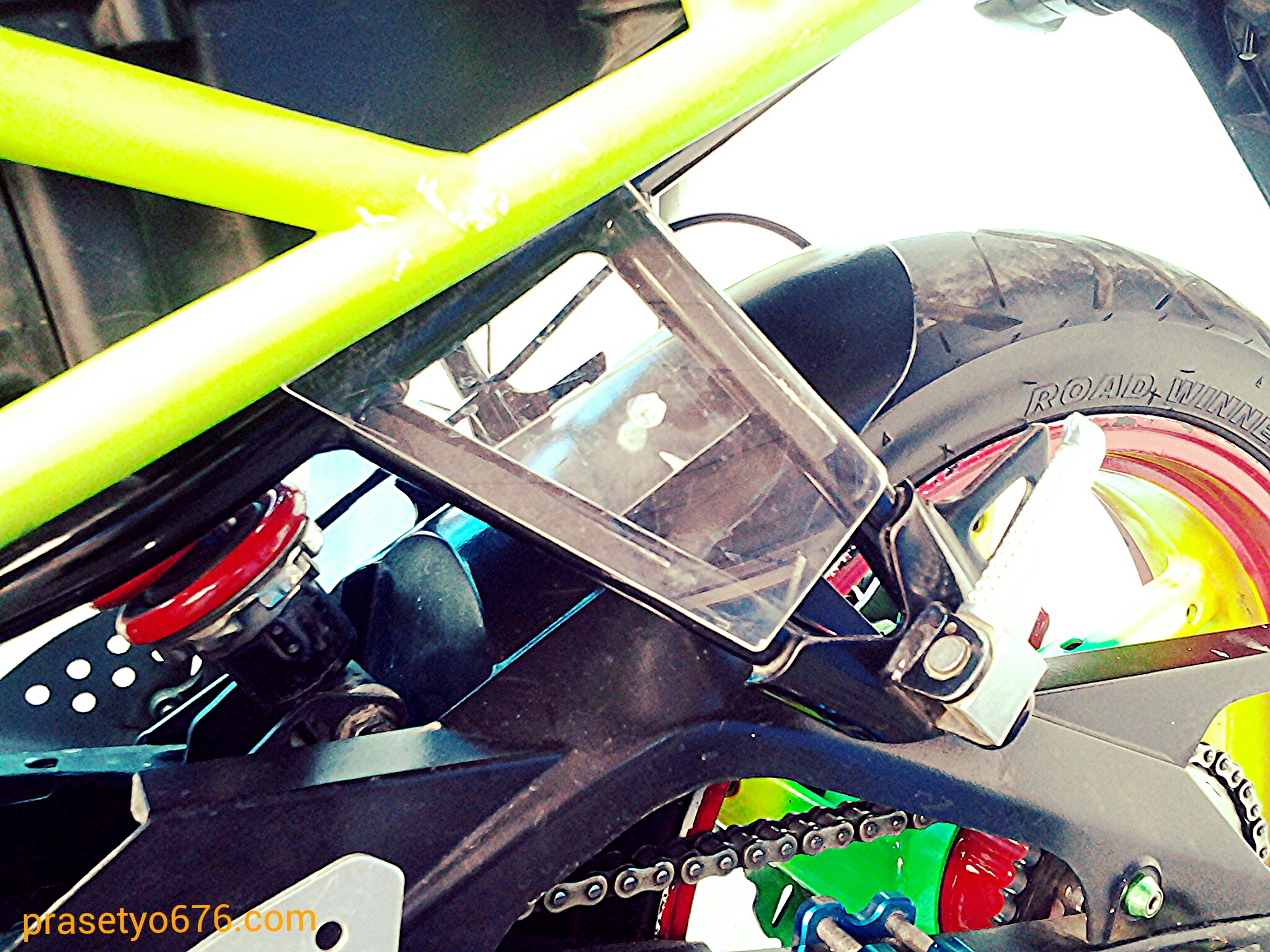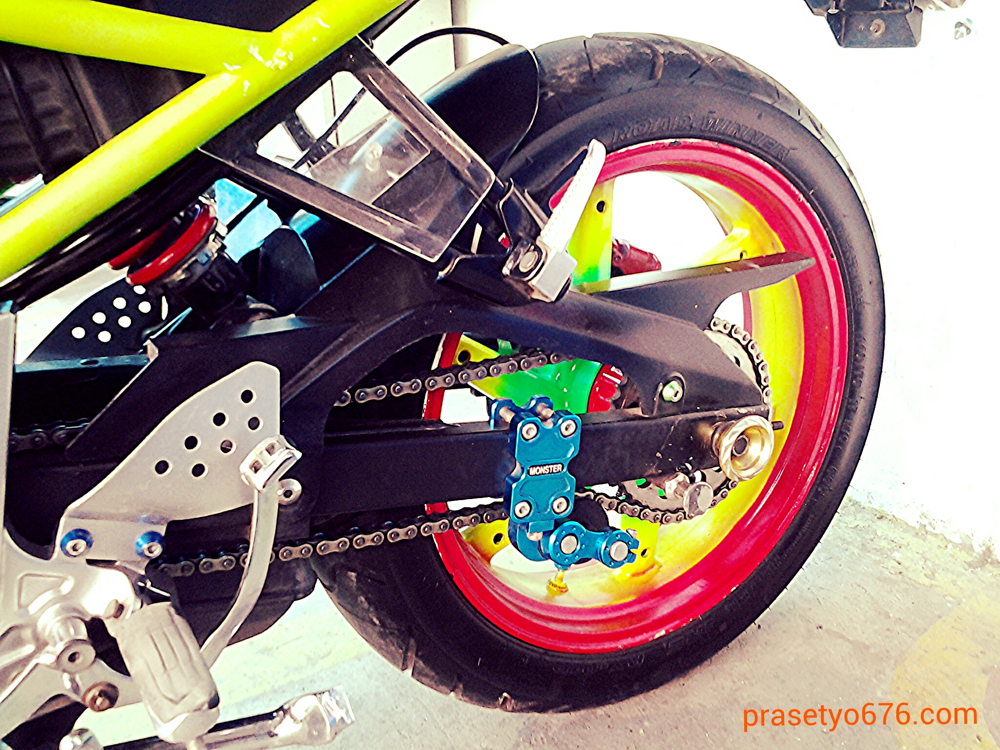 Velg belakang menggunakan merk V-Rossi dengan lebar 4.5 inch dan dilengkapi ban IRC berukuran 140/70-17 membuat tampilannya makin kekar dan gambot. Selain itu, terdapat juga aksesoris yg berfungsi untuk menahan kekencangan rantai.