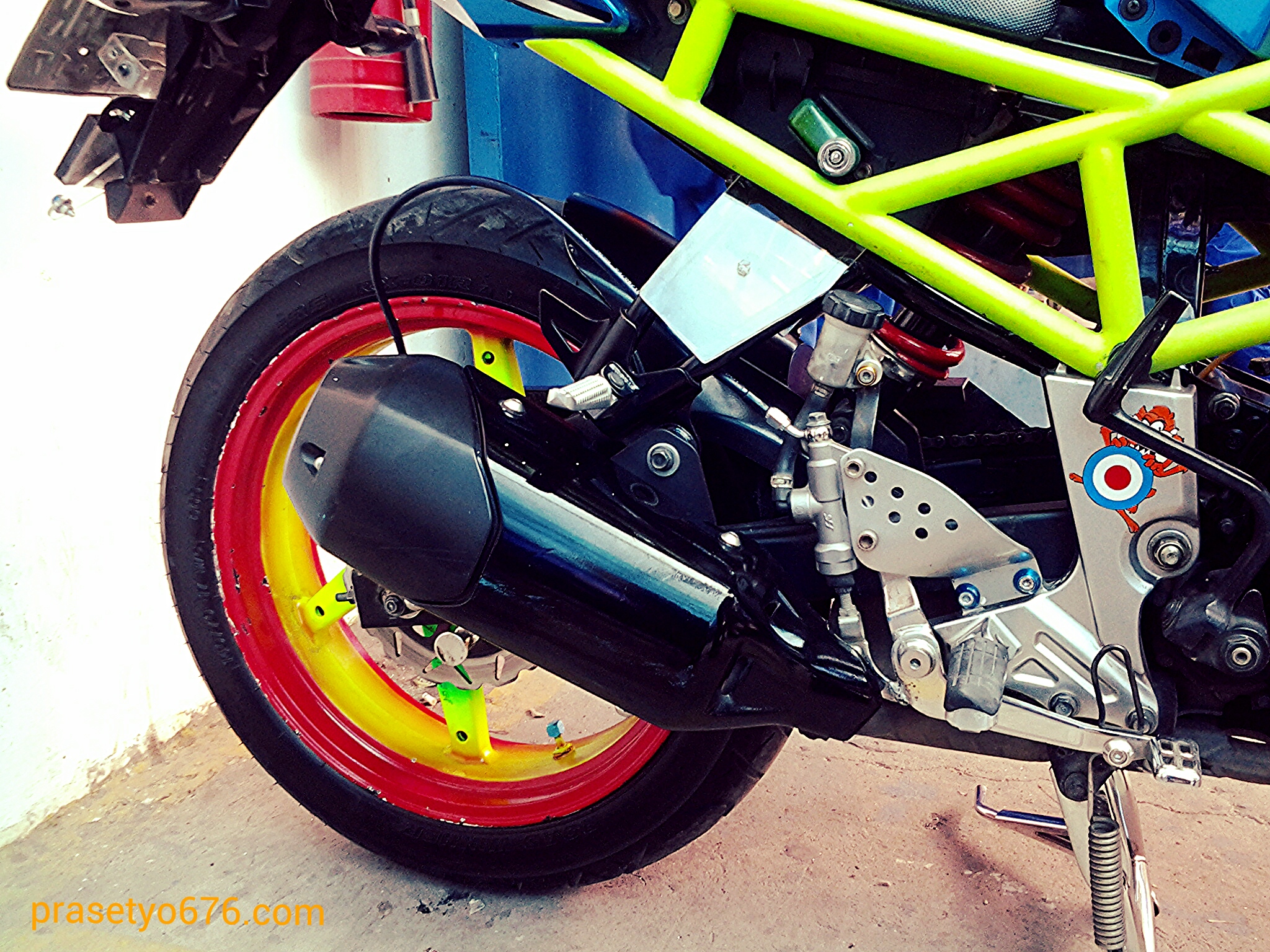 Cover silencer knalpot yg awalnya berwarna silver, dilabur warna hitam, sehingga terlihat lebih garang. Oiya, si Byson biru ini juga sudah dilakukan ubahan pada bagian rem belakangnya yg awalnya hanya drum brake, menjadi model disc brake.