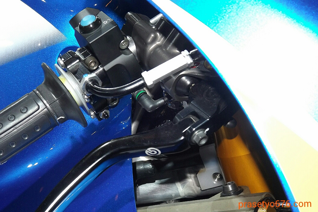 Kabel gas yg digunakan pada GSX-RR ini terlihat hanya ada satu buah. Yup, tidak seperti motor sport atau moge jalan raya pada umumnya yg menerapkan dua buah kabel gas (pull-push).