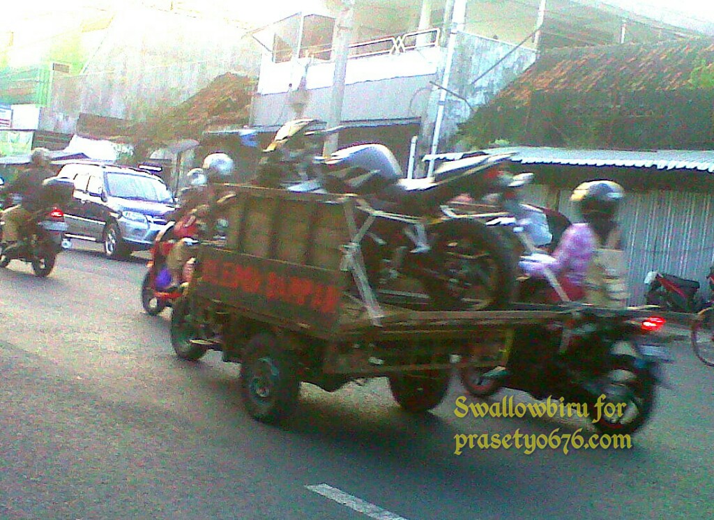 Nah dalam foto kiriman Mas Bro Swallowbiru tersebut, tampak sebuah sepeda motor sport andalan Honda, yaitu CBR150R lokal yang sedang diangkut oleh sepeda motor beroda tiga. Kondisi motor roda tiga yang mengangkutnya sudah lusuh dan kumal. Foto tersebut dijepret oleh Mas Bro Swallowbiru di daerah Wirobrajan, DIY.