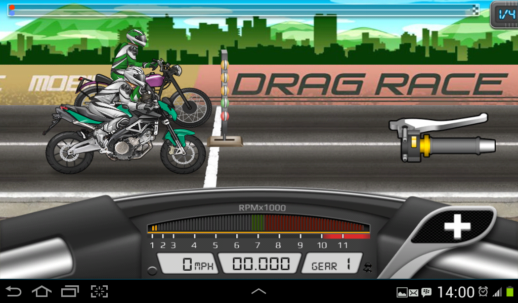 Berikut ini screenshot mode saat kita mengikuti race, di sana terdapat indikator yg menunjukkan rpm mesin, kecepatan motor, posisi gear, waktu tempuh, dan tombol untuk shifting presneling.
