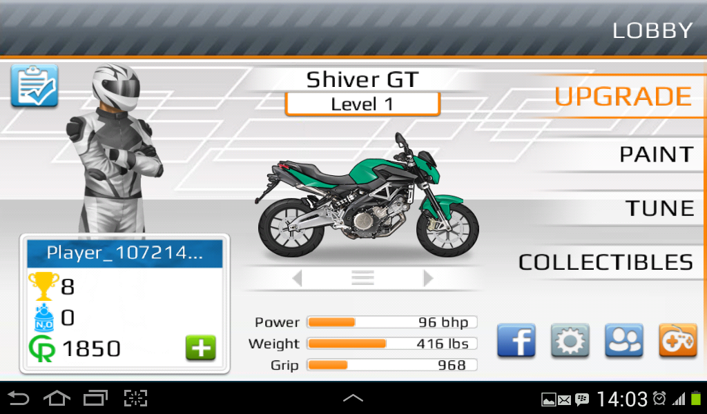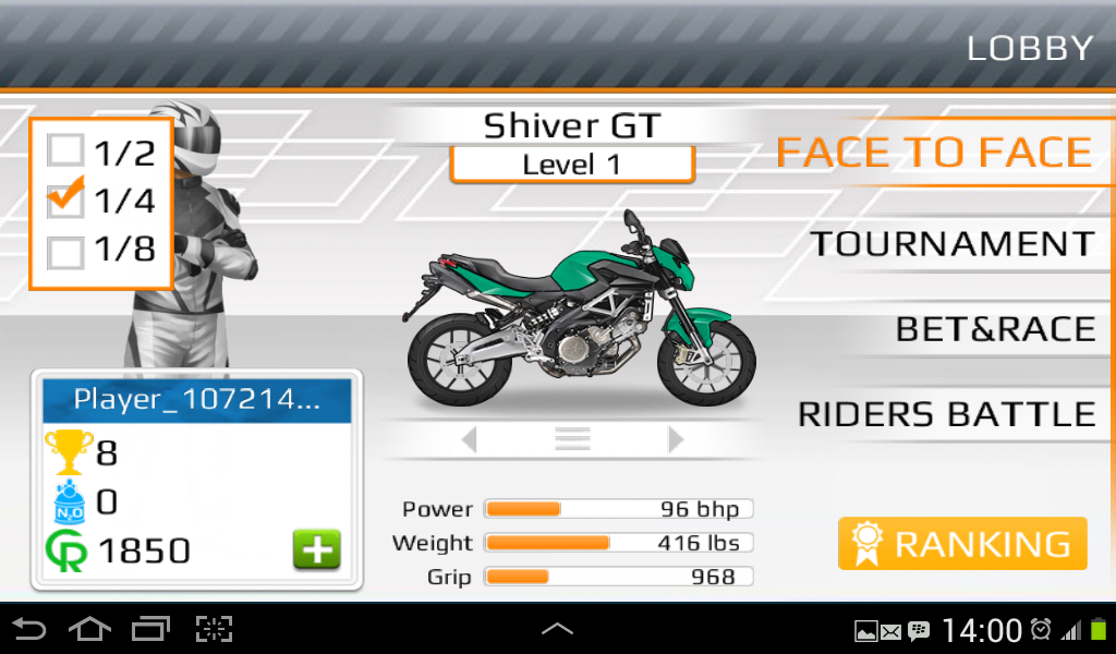 Pada sesi awal, kita disediakan motor Aprilia Shiver sebagai modal awal mengikuti balapan. Dengan mengikuti balapan, maka kita akan memperoleh sejumlah point yang bisa kita gunakan sebagai biaya melakukan modifikasi atau upgrade spesifikasi sepeda motor.