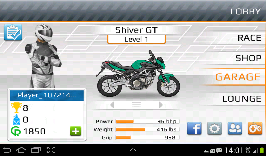 Untuk menu utama terdapat pilihan Race, Shop, Garage, Lounge.