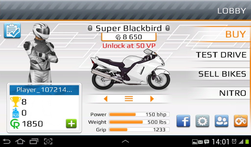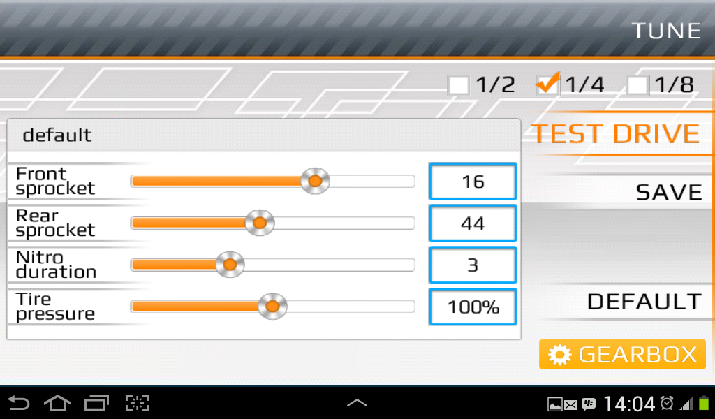 Pada menu Tune, kits dapat mengatur Sprocket depan, Sprocket belakang, durasi Nitro, dan tekanan angin ban. Sebelum kita save hasil settingan tersebut, terlebih dahulu dapat kita lakukan Test Drive untuk memastikan settingan kita sudah pas.