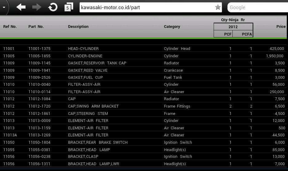 Dengan begitu, kita dapat mengestimasikan kisaran biaya apabila melakukan penggantian komponen Kawasaki Ninja 150 RR. Selain itu, dengan ditampilkannya deskripsi part beserta kodenya, maka akan lebih memudahkan kita saat ingin melakukan pembelian atau pemesanan part.