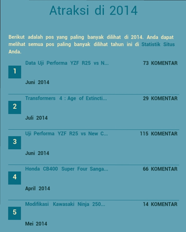 Oke, balik lagi ke pembahasan tentang komentator. Berdasarkan laporan dari WordPress, terdapat 5 komentator paling aktif selama tahun 2014. Komentator datang dari sobat pembaca serta rekan-rekan sesama blogger juga.
