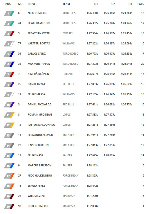 Pada urutan pertama ditempati oleh Nico Rosberg dari team Mercedes, kemudian diikuti oleh rekan setimnya yaitu Lewis Hamilton.