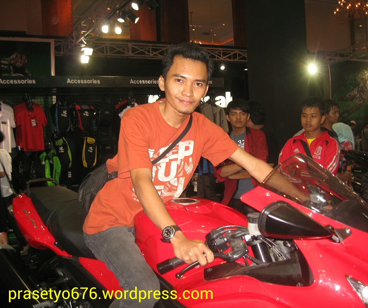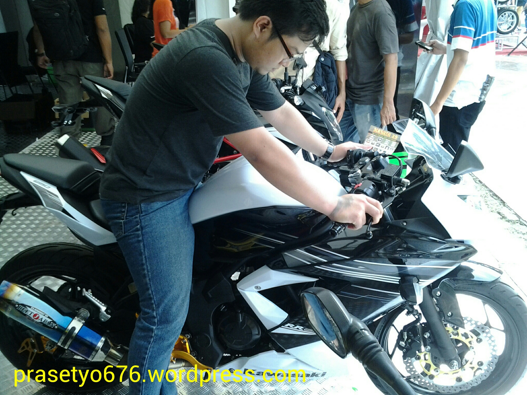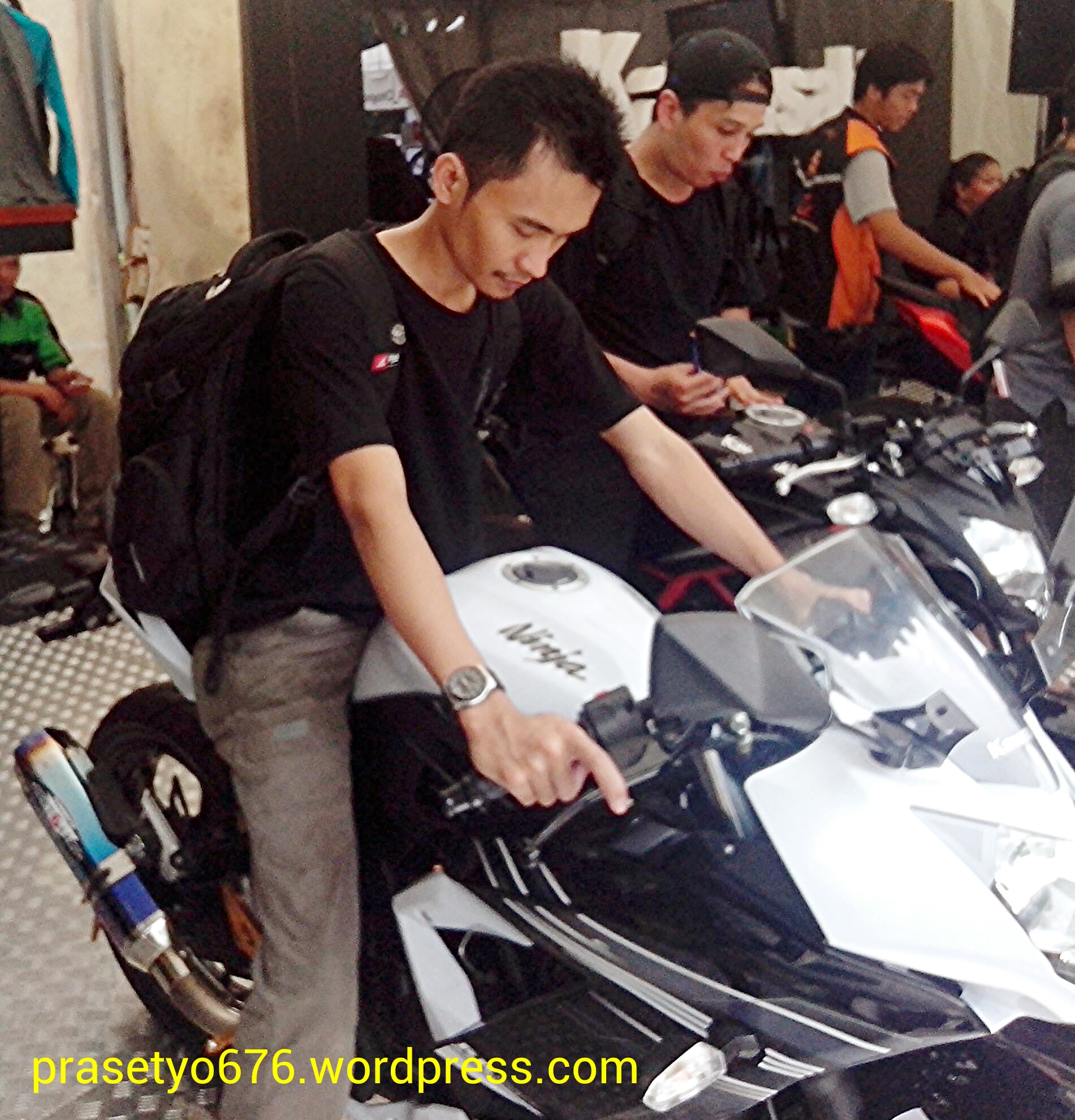 Note : Pria berkacamata pada foto di atas ini, bukan Prast 676 lho, tetapi brother yg juga sedang mencoba impresi ergonomi riding position Ninja 250RR Mono. π