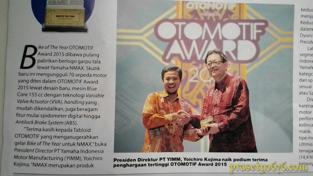 Selamat kepada Yamaha, dengan NMAX nya, atas prestasi yang diraihnya yaitu Bike of The Year OTOMOTIF Award 2015.